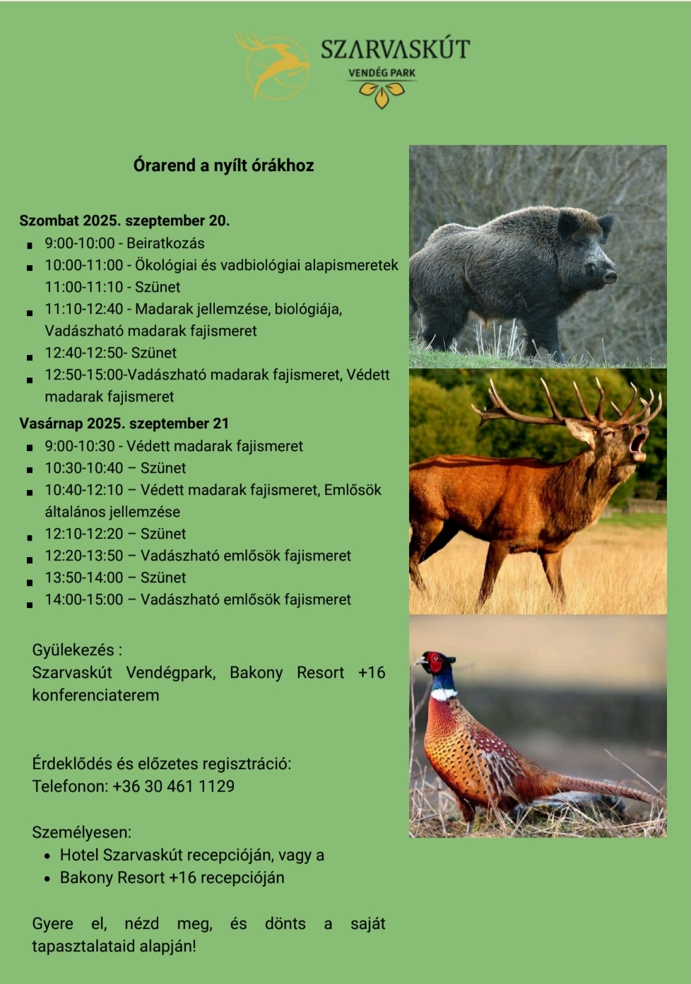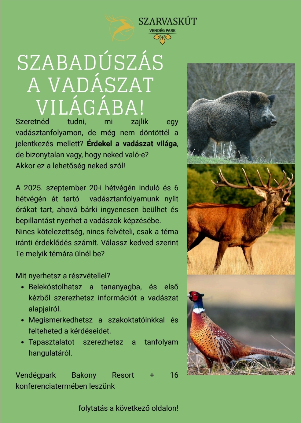 Vadásztanfolyamot hirdet a Hotel Szarvaskút****! A nyílt órákra bárki ingyenesen beülhet és bepillantást nyerhet a vadászok képzésébe. A 2025. szeptember 20-i hétvégén induló és 6 hétvégén át tartó képzésre minden érdeklődőt várnak!