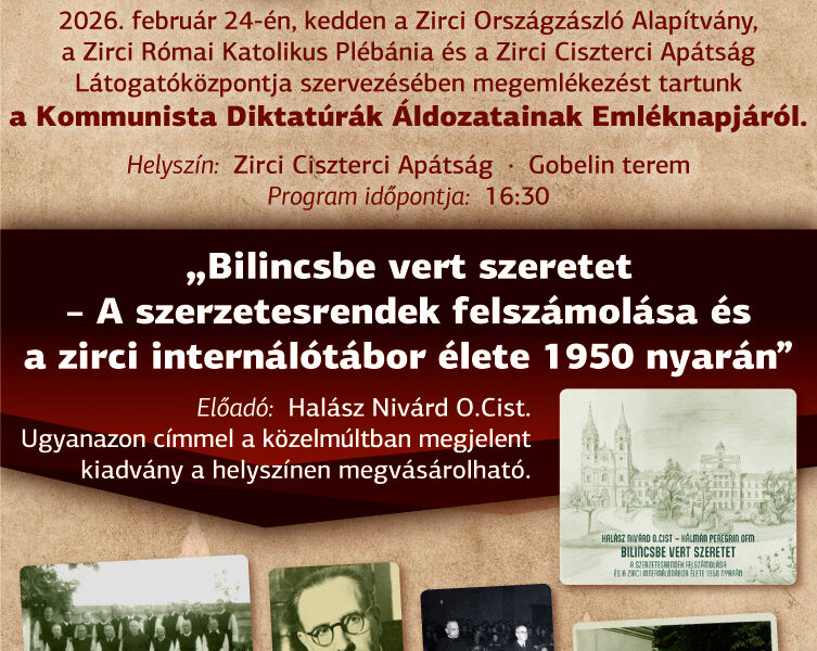 A Zirci Országzászló Alapítvány, a Zirci Római Katolikus Plébánia, és a Zirci Ciszterci Apátság Látogatóközpontja 2026. február 24-én 16.30 órakor megemlékezést tart a Kommunista Diktatúrák Áldozatainak Emléknapja tiszteletére a Gobelin teremben.
