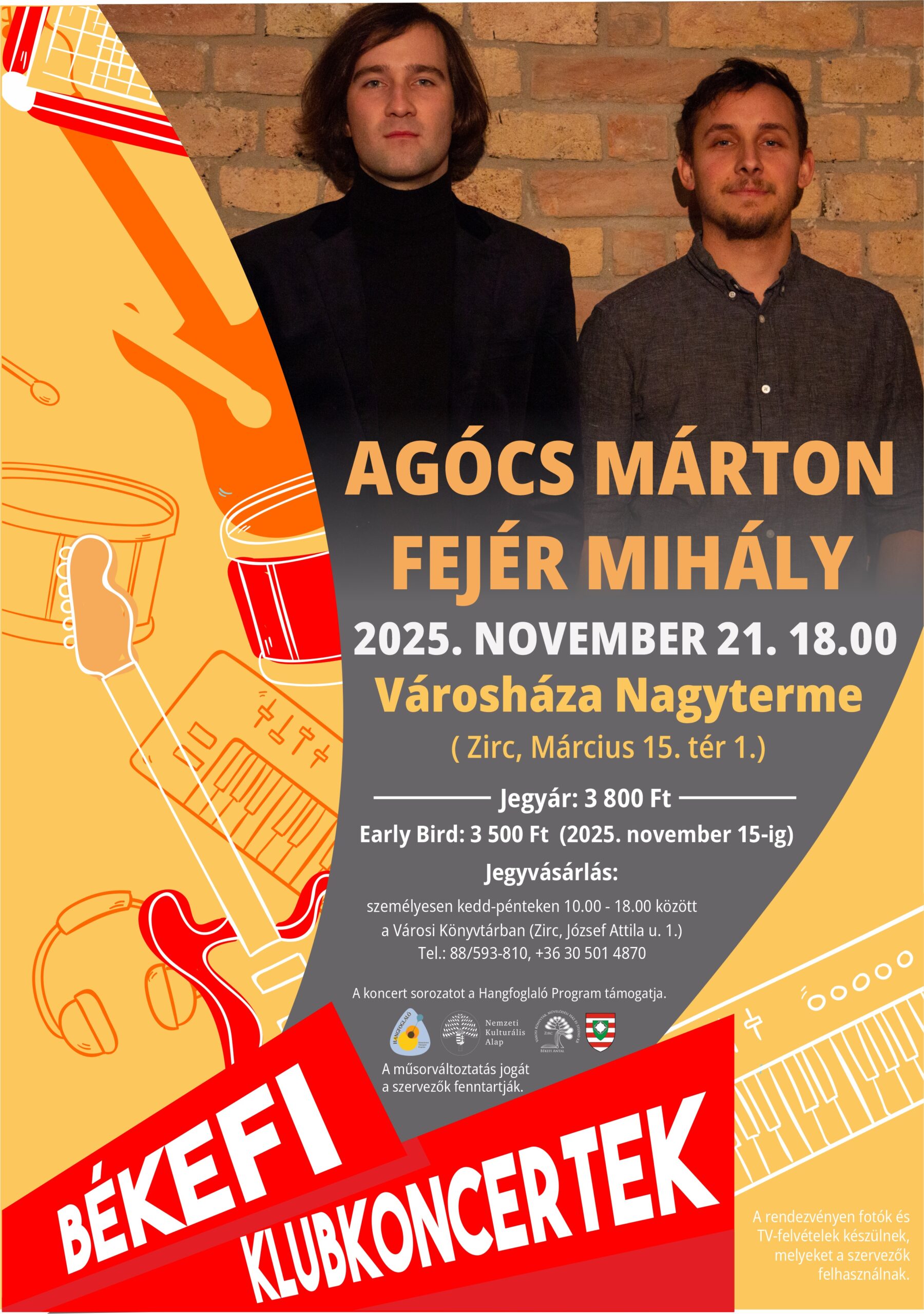 A zirci zenekedvelő közönség már megszokhatta, hogy hónapról-hónapra nagyszerű előadók lépnek fel városunkban, és ez novemberben sem lesz másként: a Nemzeti Kulturális Alap Hangfoglaló Programja által támogatott „Békefi Klubkoncertek” sorozat következő fellépői az Aurevoir. zenekarból ismerős Agócs Márton és Fejér Mihály lesznek, november 21-én, 18 órától!