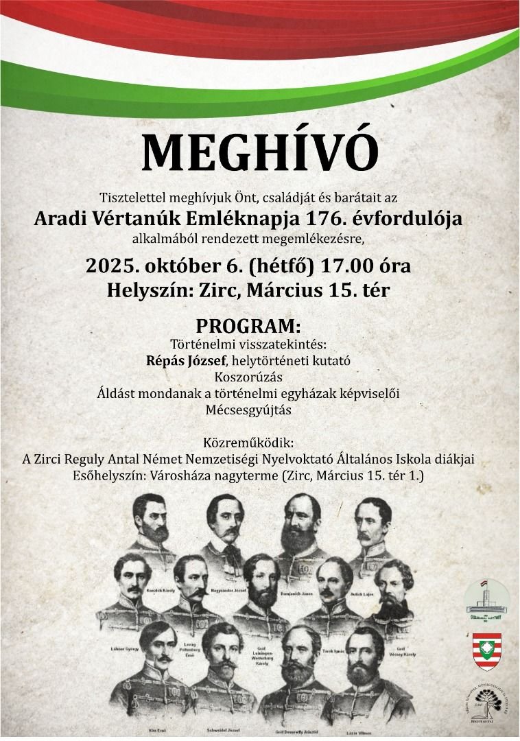 Emlékezzünk együtt az Aradi Vértanúkra, idézzük fel közösen a hősök örökségét és a szabadságharc eszméjét! Október hatodikán 17 órakor az Aradi Vértanúk kivégzésének 176. évfordulóján tisztelettel és főhajtással emlékezünk az 1849-ben vértanúhalált halt tisztekre a Március 15. téren.