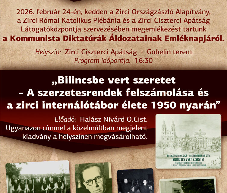 Bilincsbe vert szeretet – A szerzetesrendek felszámolása és a zirci internálótábor élete 1950. nyarán című könyv szerzője, Halász Nivárd O. Cist. előadását hallgathatják meg az érdeklődők.