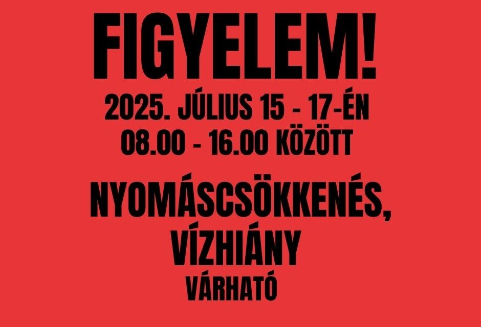 Nyomáscsökkenés, esetleges vízhiány várható több településen 2025. július 15 – 17. között!