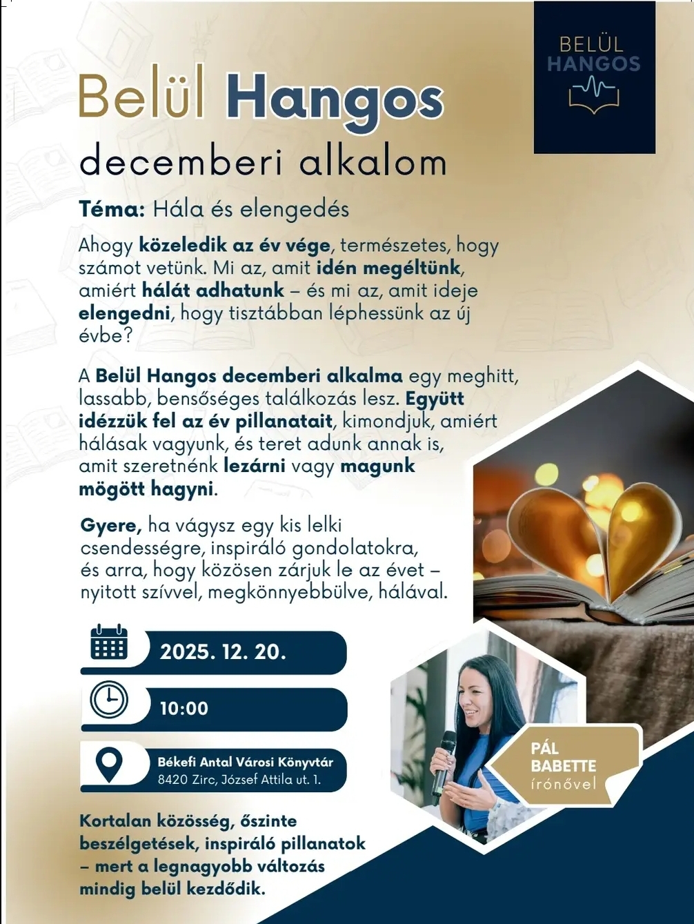 Az év vége mindig különleges időszak. Ahogy közelednek az ünnepek, mindannyian „lassabb fokozatra” kapcsolunk, visszatekintünk arra, amit idén megéltünk és próbáljuk megérteni, mit is hozott számunkra az idei esztendő. Pont erre a lelki folyamatra épül a Belül Hangos decemberi alkalma, amely ezúttal is egy bensőséges találkozásra hív mindenkit, aki szeretne egy pillanatra megállni, mélyebben kapcsolódni önmagához és másokhoz. A téma: Hála és elengedés.