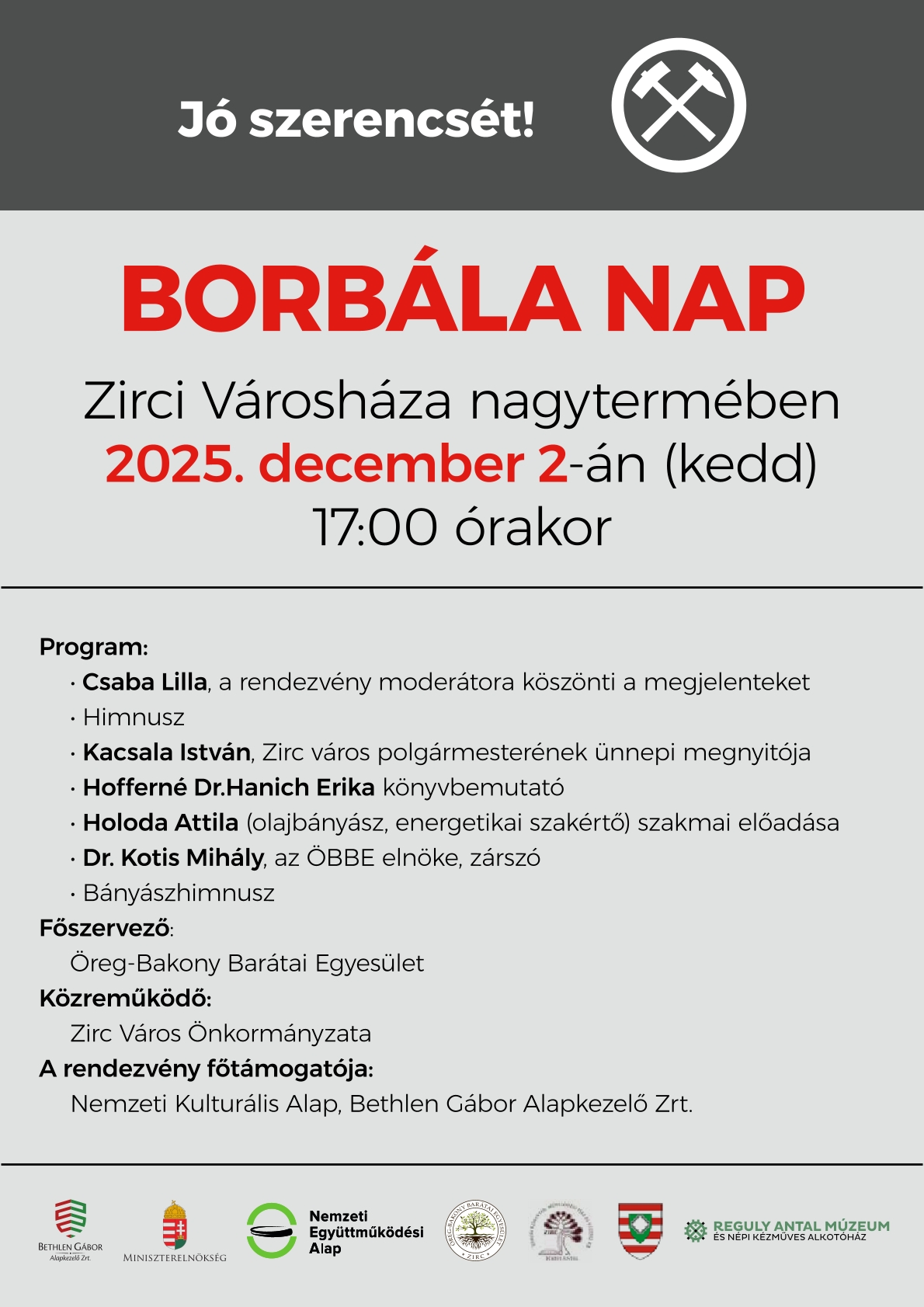 Az Öreg-Bakony Barátai Egyesület főszervezésében december másodikán 17 órai kezdettel Borbála napi ünnepségre várják az érdeklődőket a Zirci Városháza Nagytermébe.