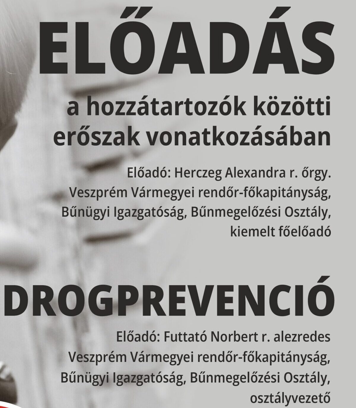 A hozzátartozók közötti erőszak vonatkozásában dr. Herczeg Alexandra r. őrgy., a Veszprém Vármegyei rendőr-főkapitányság, Bűnügyi Igazgatóság, Bűnmegelőzés Osztály kiemelt főelőadója, valamint drogprevenció témában Futtató Norbert r. alezredes, a Veszprém Vármegyei rendőr-főkapitányság, Bűnügyi Igazgatóság, Bűnmegelőzés Osztály osztályvezetője tart előadást május 21-én 17 órától a Városi Könyvtár klubtermében, Zircen.