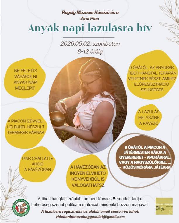 A nap folyamán Szurgyi Zsuzsi vezetésével kézműves foglalkozáson vehetnek részt az alkotni vágyók, a kreatív program mellett a gyerekeket játékmester várja a piacon, így a család minden tagja tartalmasan töltheti az időt. Az anyukák, nagymamák és minden pihenésre vágyó vendég számára különleges kikapcsolódást kínálnak: ingyenes tibeti hangtál terápia segíti a feltöltődést a Reguly Múzeum Kávézóban. A szervezők arra kérik az érdeklődőket, hogy előzetesen jelezzék részvételi szándékukat, és ha lehetőségük van rá, hozzanak magukkal polifoamot – ennek hiányában azonban a helyszínen is biztosítanak, amennyiben ezt előre jelzik.