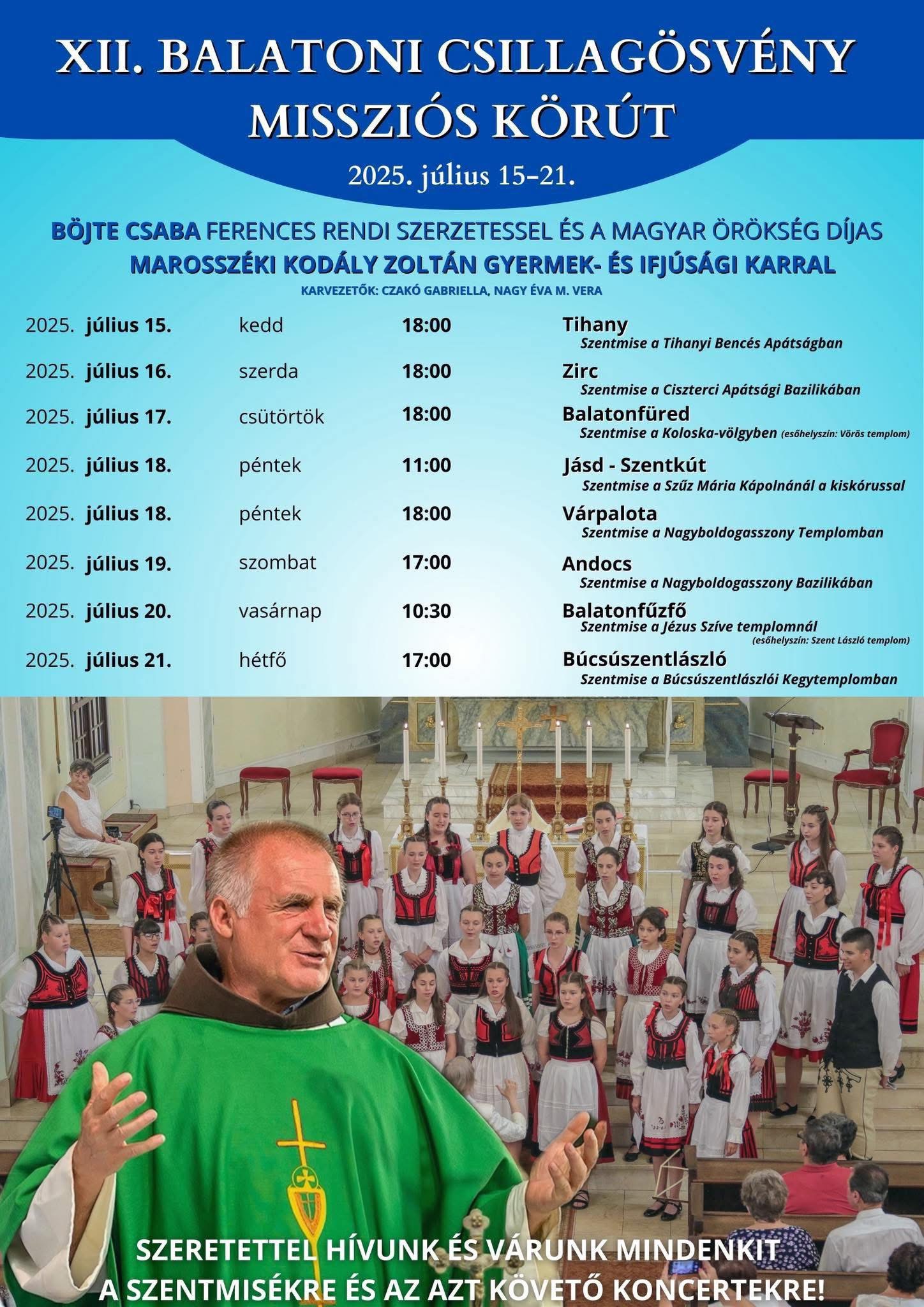 A Zirci Plébánia Karitász csoportja idén már ötödik alkalommal fogadja és látja vendégül a Balatoni Csillagösvény Missziós Körú-at. Az esemény július 16-án szerdán lesz a zirci Bazilikában, ahol 18.00 órától Böjte Csaba testvér szentmisét mutat be. A szentmisén közreműködik és azt követően koncertet ad a Magyar Örökség díjas Marosszéki Kodály Zoltán Gyermek-és Ifjúsági Kar.