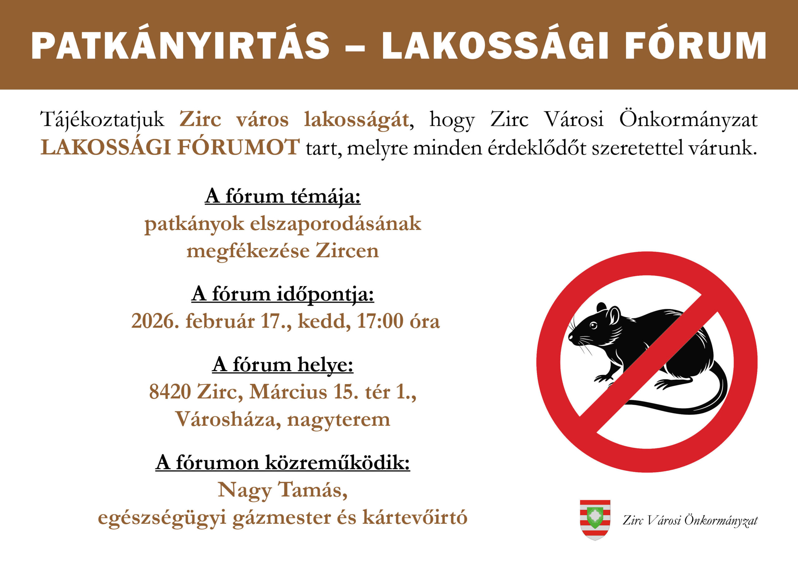 Lakossági fórumot tart Zirc Városi Önkormányzata a patkányok elszaporodásának megfékezéséről. Az eseményre 2026. február 17-én, kedden 17 órakor kerül sor a Zirci Városháza nagytermében.