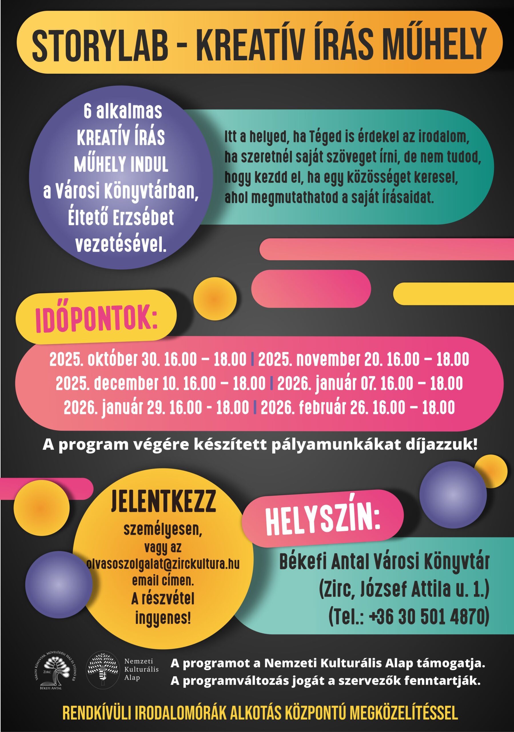 A Nemzeti Kulturális Alap támogatásával hat alkalmas kreatív írás műhely indul Storylab néven a Békefi Antal Városi Könyvtárban, Éltető Erzsébet vezetésével.