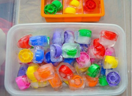 Játék jéggel – Kicsi edényekbe tegyenek vizet, bele pedig egy-egy kis figurát, majd fagyasztás után kezdődhet az állatok kiszabadítása. De akár ételfestékkel színezett jégkockákat is készíthetnek, amivel -miután megfagyott- festhetnek a gyerekek nagy papírra.