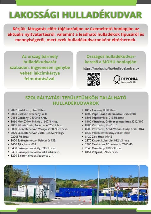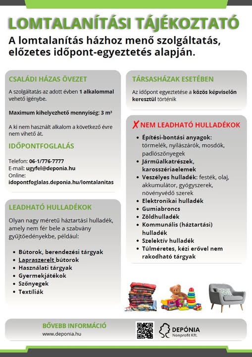 A hulladék elszállításáért felelős Depónia Nonprofit Kft. az alábbi plakátok segítségével tájékoztatja a lakosságot a lomtalanítással és a hulladékudvarok használatával kapcsolatban.