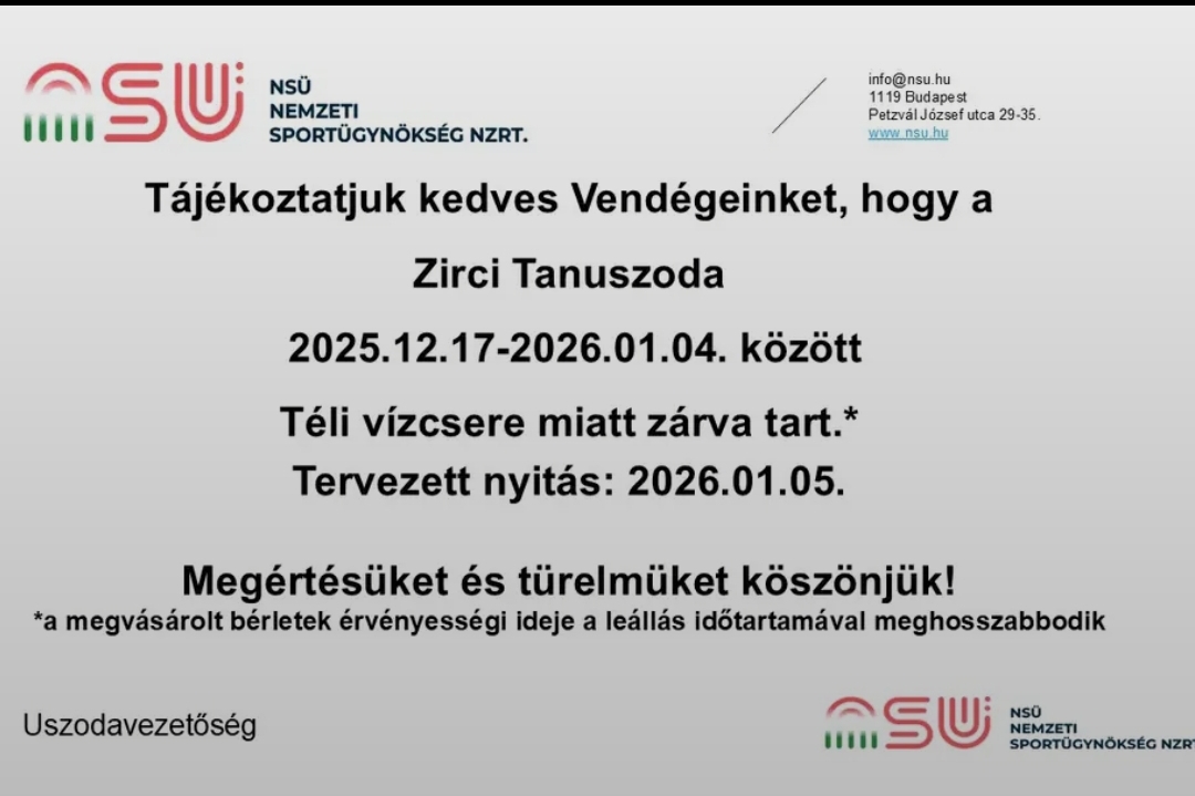 Az uszoda várhatóan 2025. január 5-én nyit újra. Fontos információ, hogy a megvásárolt bérletek érvényességi ideje a leállás időtartamával meghosszabbodik!