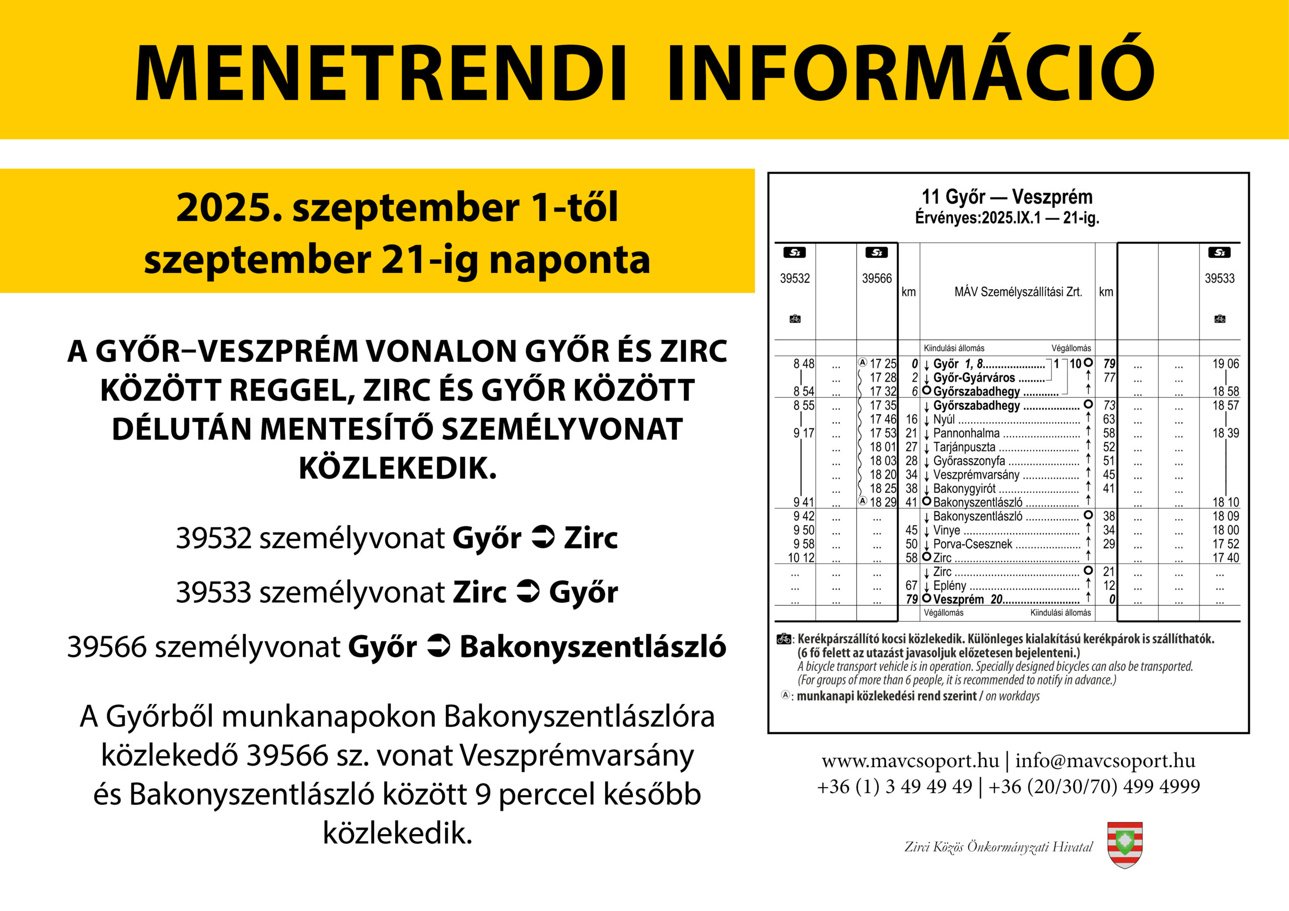 2025. szeptember 1-21. között a Győr-Veszprém vonalon Győr-Zirc között reggel, Zirc és Győr között délután mentesítő személyvonat közlekedik. A Győrből munkanapokon Bakonyszentlászlóra közlekedő 39566 sz. vonat Veszprémvarsány és Bakonyszentlászló között 9 perccel később közlekedik.