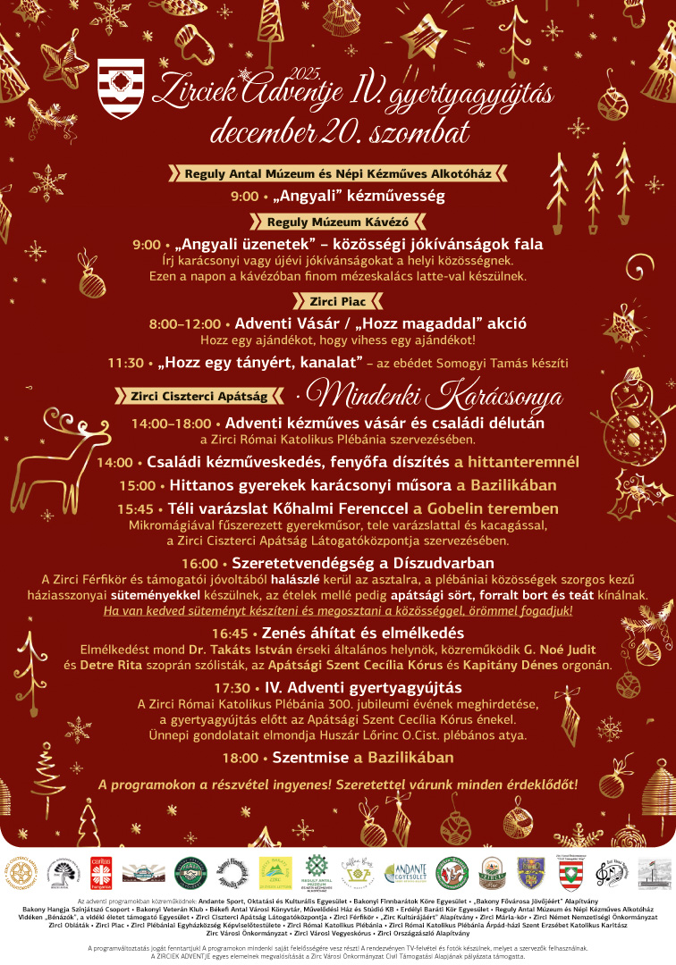 Napokon belül elérkezik az utolsó adventi hétvége – a páratlan közösségi összefogás eredményeként valódi ünnepi pillanatokat élhetünk át Zircen, december 20-án, szombaton. Az ingyenes programokra szeretettel várnak mindenkit! Készüljünk együtt az év legszebb ünnepére!